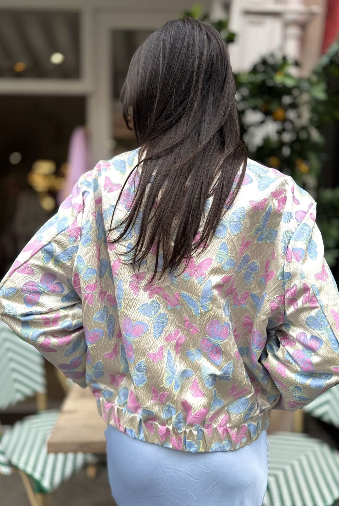 Version romantique : une veste matelassée imprimée + robe fluide + sandales dorées.