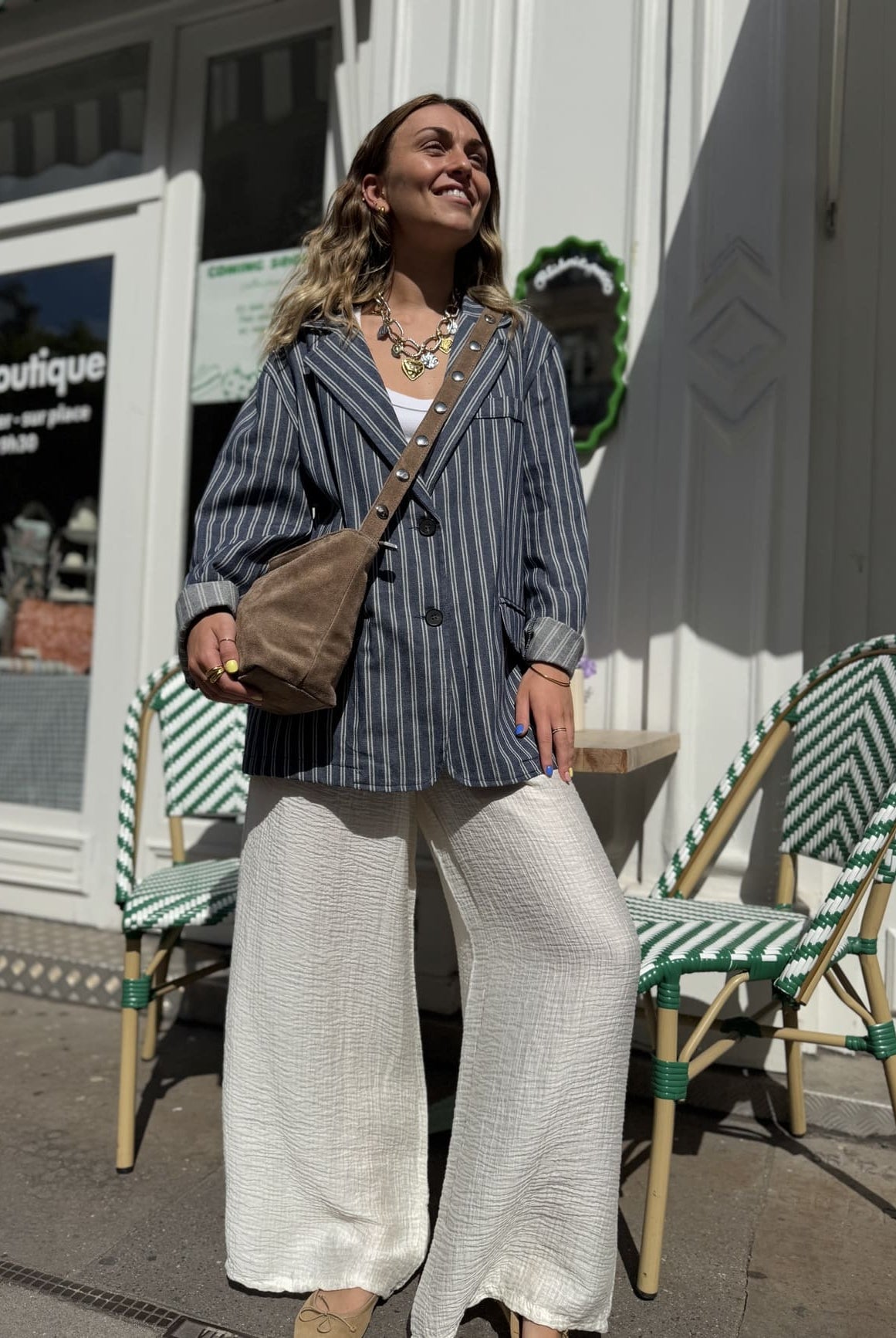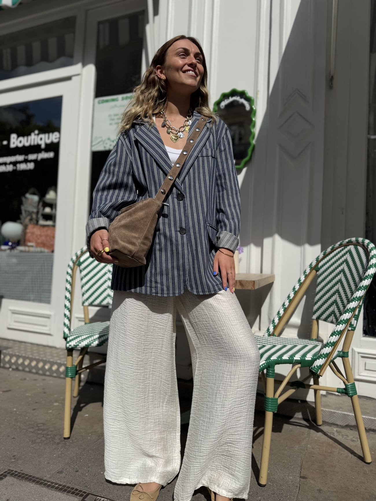 Version minimaliste : une veste en lin beige + pantalon ample + mules en cuir.